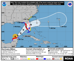 Согласно карте, опубликованной на сайте Национального центра по отслеживанию ураганов (NHC), в настоящее время «Милтон» движется от полуострова Юкатан в Мексике на северо-восток. Ожидается, что выход на побережье полуострова Флорида произойдет поздним вечером в среду, 9 октября.